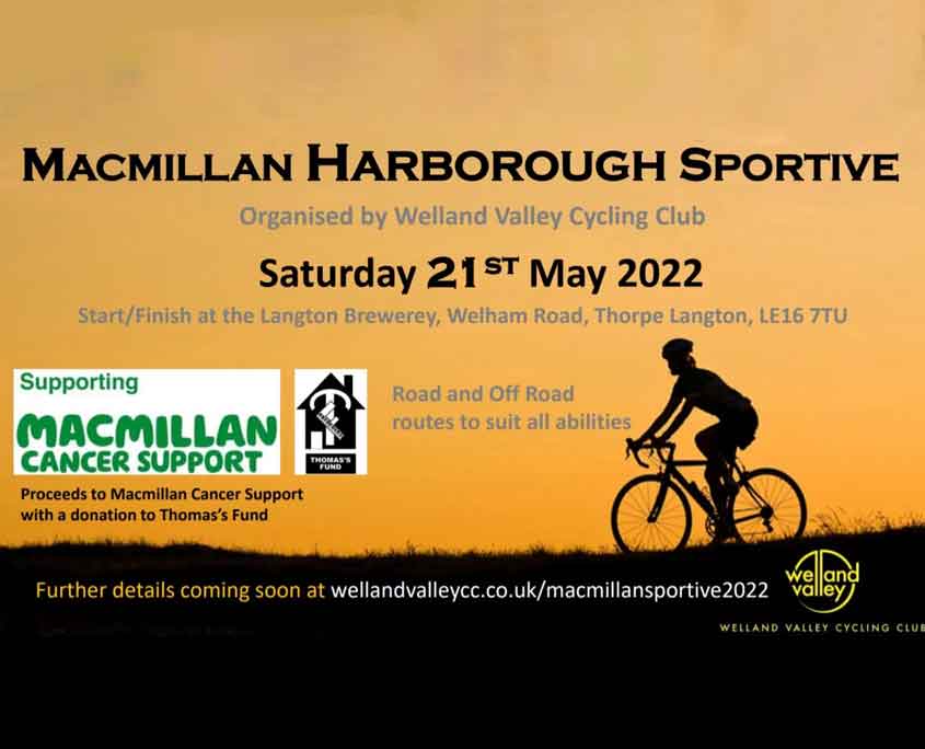 A date for the diary is Saturday 21st May. The Macmillan Harborough Sportive, the event is organised by the Welland Valley Cycling Club.